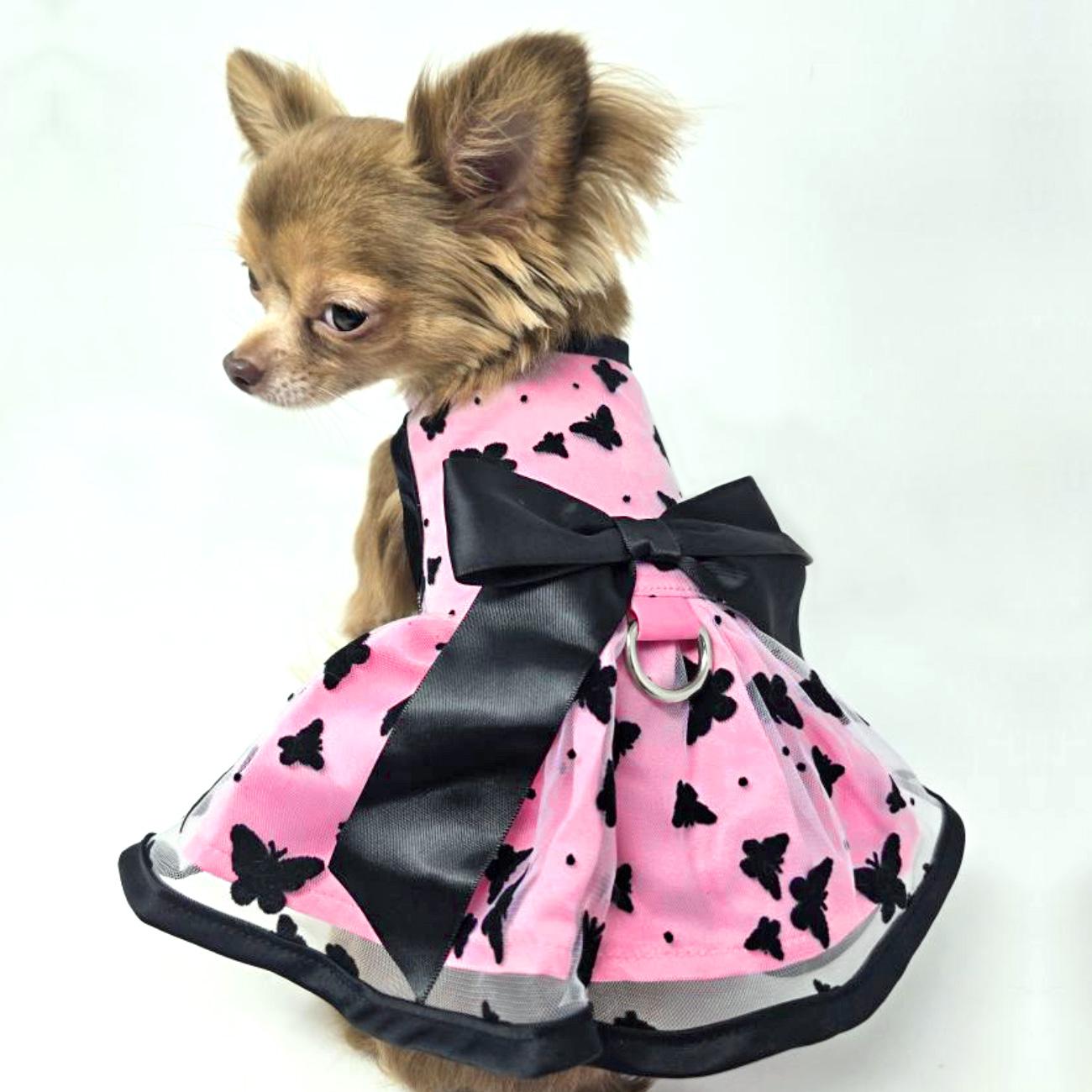 You'll be all aflutter with this classically elegant harness dress comes in pink with black trim, black bow, and a sweet butterfly overlay.  Comes with a solid color satin leash and D-ring (size XL does not have D-ring or leash hole).