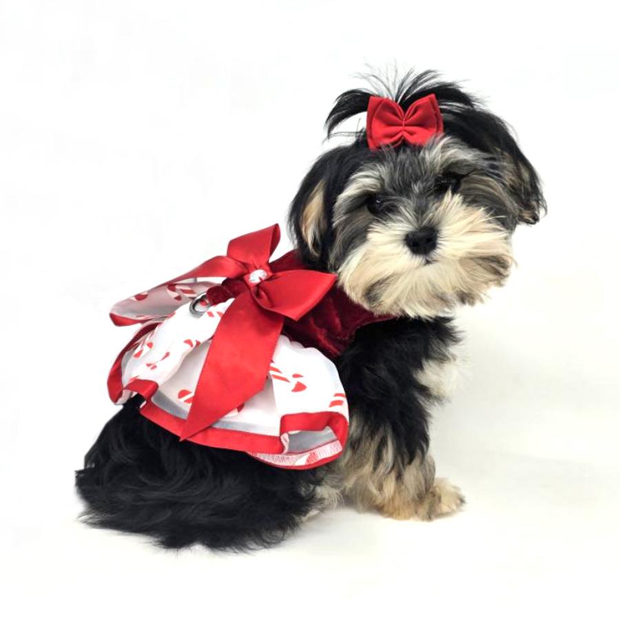 Our very popular Candy Cane dress features an adorable candy cane tulle skirt, red satin bow with rhinestone center, velvet body and white collar. This one is a must have for the Holidays. Our holiday dresses also feature a built in d-ring and include a matching leash for easy walking.