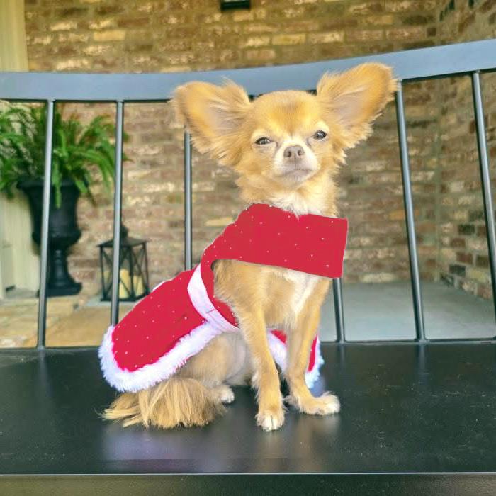 Mrs. Claus never looked so glamorous! This beautiful red velvet dress is covered in sparkles. The bling continues with a rhinestone buckle on the white belt and don't forget the white fur trim around the skirt.