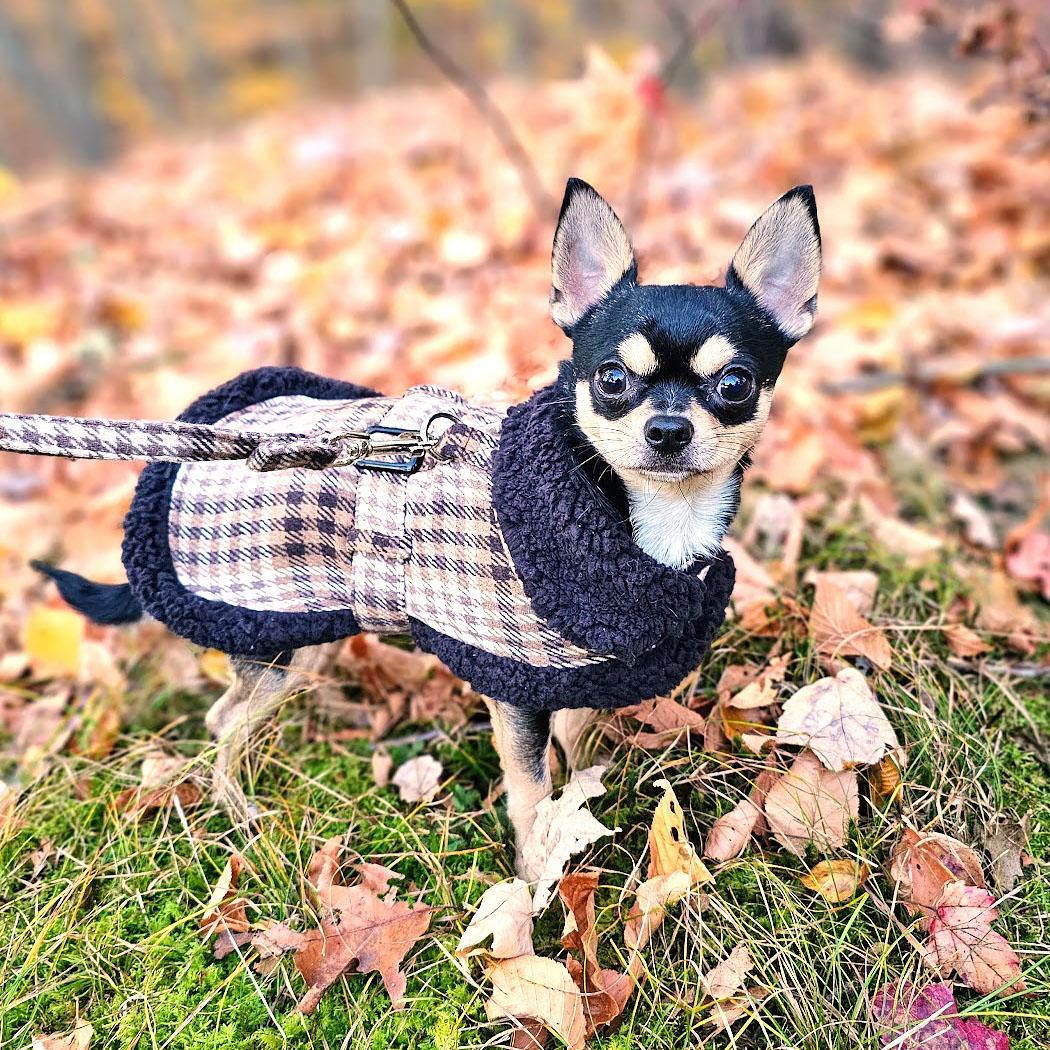 Check out the new brown & white plaid pattern on our Brown & White Plaid Classic Designer Coat with thick, warm and soft fleece fur collar and lining. This coat features touch fastener neck and chest closures. It includes a matching leash and a D-ring for easy leash attachment. Made with high-quality cotton/polyblend outer. We've continued the quality with double box stitch reinforced D-ring attachments.