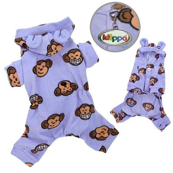 Super cute "Silly Monkey" face expressions all over this soft fleece pajamas. A pair of adorable monkey ears attached on the hood, with snap button closure. A small D-Ring attached above the first snap button to add on a "Klippo" charm or ID tag!  (Each outfit comes in its own Klippo logo charm.)